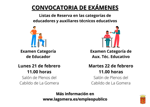 El Cabildo de La Gomera ha informado, este sábado, de la convocatoria de las fechas de examen para la creación de listas de reserva en las categorías de educadores y auxiliares técnicos educativos para los centros sociosanitarios de competencia insular con el fin de atender necesidades temporales y urgentes derivadas de su funcionamiento.