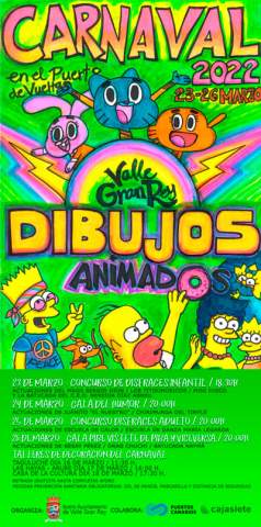 El Ayuntamiento de Valle Gran Rey ha presentado hoy la programación de sus Carnavales 2022, que se celebran en el municipio del 23 al 26 de marzo en el recinto carnavalero que estará ubicado en el Puerto de Vueltas, bajo la temática de ‘Dibujos animados’. Unas fiestas que, un año más, estarán adaptadas a las medidas actuales generadas por la Covid-19.