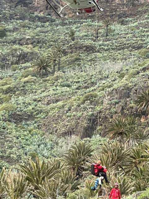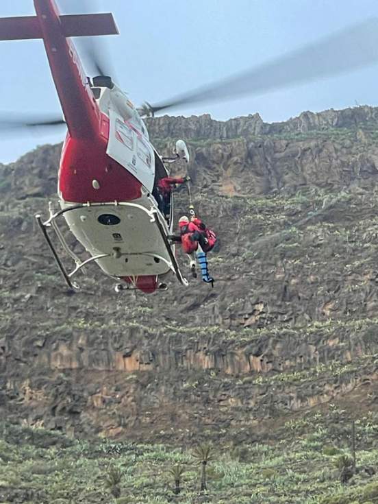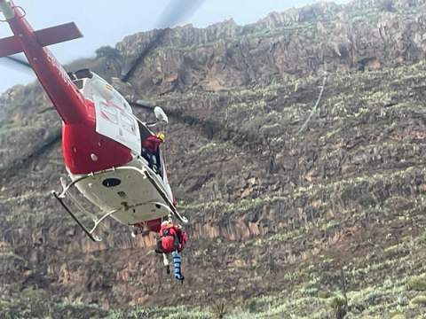 Rescatadores del helicóptero del GES se descolgaron de la aeronave y con la colaboración de los Bomberos, procedieron al rescate de la afectada y la izaron hasta la aeronave para evacuarla hasta la helisuperficie de San Sebastián de La Gomera.