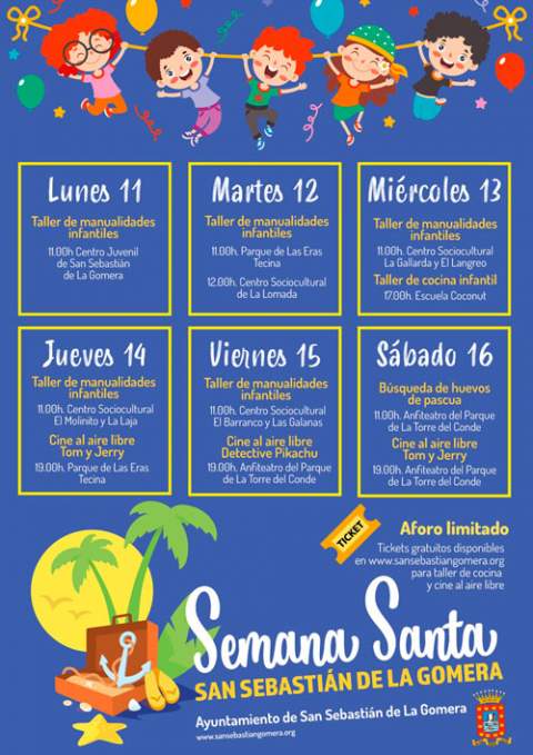 El Ayuntamiento de San Sebastián de La Gomera desde la Concejalía de Ocio y Tiempo Libre, presenta el programa de actividades infantiles para esta Semana Santa. Esta atractiva agenda recreativa contempla manualidades, cocina, cine al aire libre y una interesante dinámica de búsqueda de huevos de Pascua. Cabe destacar que todas las actividades son de carácter gratuito, y a excepción de las manualidades, el taller de cocina y el cine al aire libre requieren de inscripción previa, ya que son de aforo limitado. Por lo tanto, la reserva de plazas está disponible a través de la web municipal www.sansebastiangomera.org.