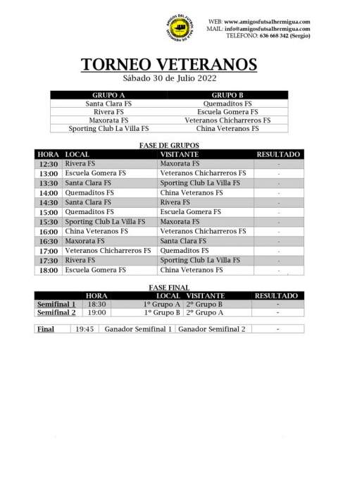 Ocho equipos disputarán el torneo de Veteranos (equipos de La Gomera, La Palma y Tenerife), en una renovada cancha de fútbol sala del Curato de Hermigua, la pelota empezará a rodar a partir de las 12:30 horas del Sábado, 30 de Julio.