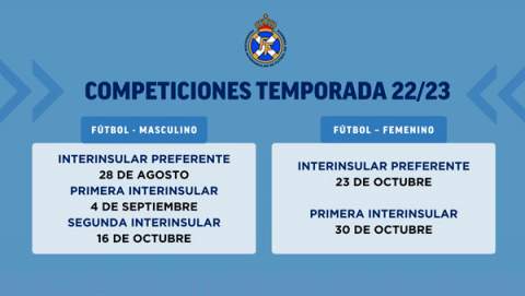 En categoría masculina, la primera competición de fútbol que arrancará será la División Interinsular Preferente cuya jornada inaugural está prevista para el 28 de agosto. La Primera Intersinsular comenzará el 4 de septiembre y finalmente la Segunda Interinsular iniciará la competición el 16 de octubre.