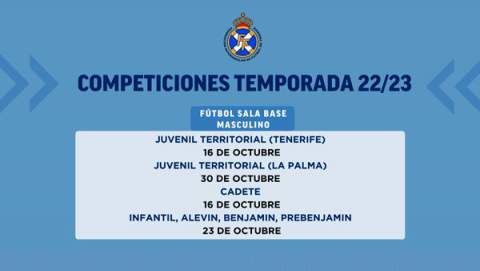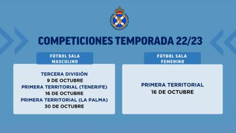 En lo referente al fútbol sala, la primera competición será la 3ª División cuya fecha de inicio se ha programado para el 9 de octubre, mientras que la Primera Territorial -tanto masculina como femenina- tendrá su primera jornada el 16 de octubre.